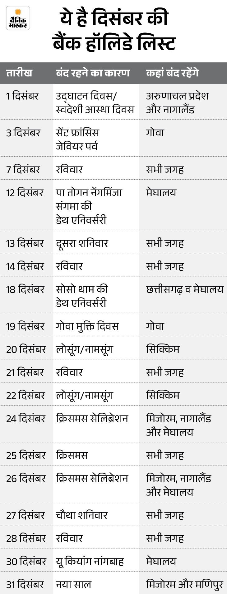 ऐसे में अगर आपको अगले महीने बैंक से जुड़ा कोई जरूरी काम हो तो इन छुट्टियों के दिनों को छोड़कर आप बैंक जा सकते हैं। यहां देखें दिसंबर महीने में आपके राज्य में बैंक कब-कब बंद रहेंगे…