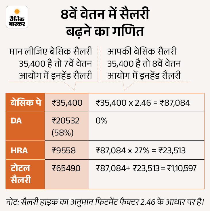 मान लीजिए 7वें वेतन आयोग के हिसाब अभी आपकी बेसिक सैलरी 35,400 रुपए है तो इसमें DA और HRA के बाद ये करीब 65,500 रुपए हो जाती है। वहीं 8वें वेतन आयोग के बाद ये 1 लाख 10 हजार के पार हो सकती है।