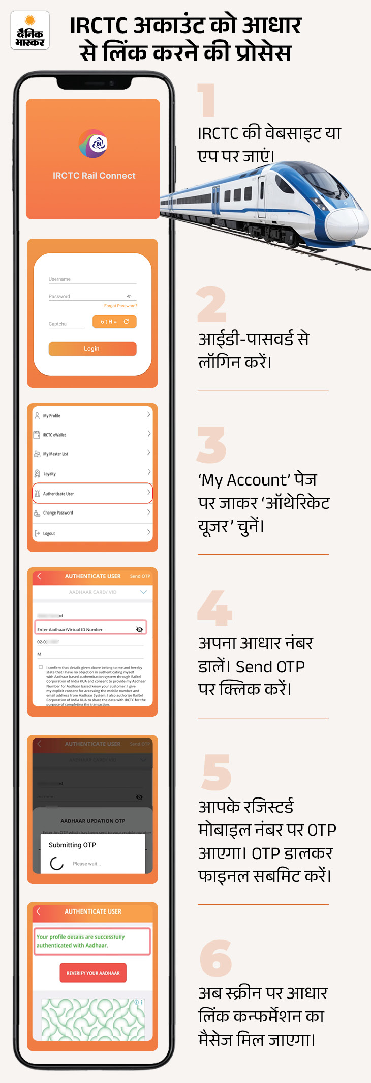 6. 12 जनवरी से दिन में रेलवे रिजर्वेशन के लिए आधार जरूरी 12 जनवरी से ऐसे यूजर्स जिनका अपना IRCTC अकाउंट आधार से लिंक नहीं है, वो सुबह 8 से रात 12 बजे तक टिकट बुक नहीं कर सकेंगे। ये नियम केवल रिजर्व टिकट बुकिंग खुलने के पहले दिन के लिए हैं।