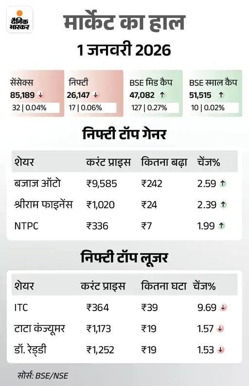 साल के पहले दिन यानी गुरुवार 1 जनवरी 2026 को शेयर बाजार में फ्लैट कारोबार हुआ। सेंसेक्स 32 अंक गिरकर 85,189 पर बंद हुआ। निफ्टी में 17 अंक की बढ़त रही, ये 26,147 पर बंद हुआ।