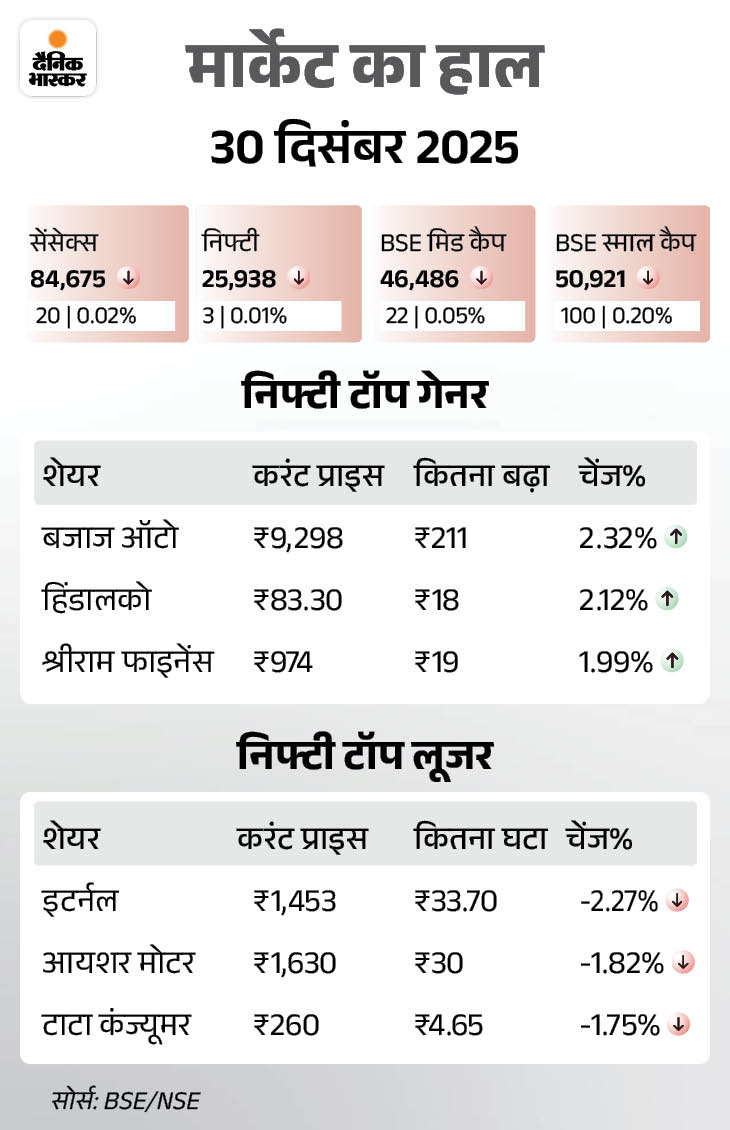 हफ्ते के दूसरे कारोबारी दिन आज यानी 30 दिसंबर को शेयर बाजार में फ्लैट कारोबार रहा। सेंसेक्स 20 अंक गिरकर 84,675 पर बंद हुआ है। निफ्टी में 3 अंक की मामूली गिरावट रही, ये 25,938 पर बंद हुआ है।