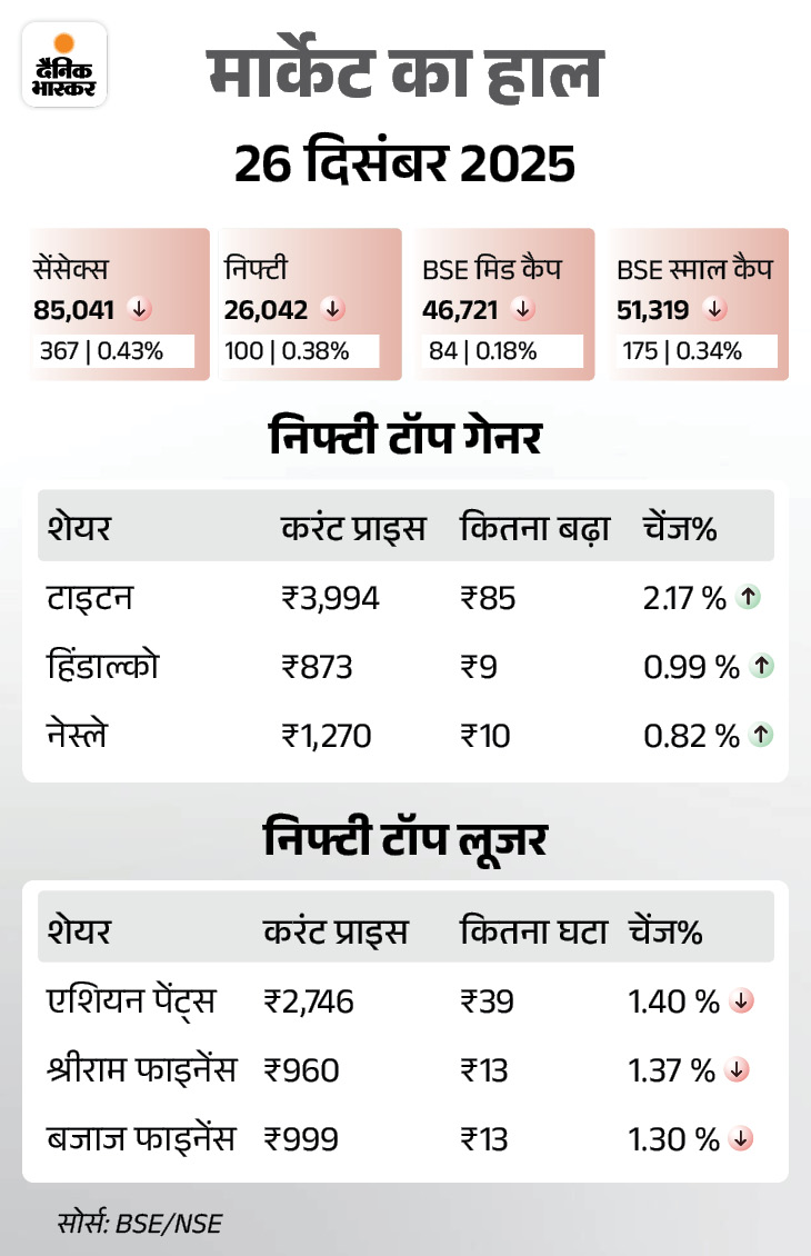 हफ्ते के आखिरी कारोबारी दिन यानी शुक्रवार, 26 दिसंबर को शेयर बाजार में गिरावट रही। सेंसेक्स 367 नीचे 85,041 पर बंद हुआ। निफ्टी में भी 100 अंक की गिरावट रही, ये 26,042 पर बंद हुआ।
