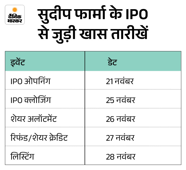 सुदीप फार्मा के IPO का आज यानी 24 नवंबर को दूसरा दिन है। सुदीप फार्मा का IPO 21 नवंबर को खुला और 25 नवंबर को बंद होगा। पहले दिन ही ये इश्यू पूरा दोगुना सब्सक्राइब हो चुका है।