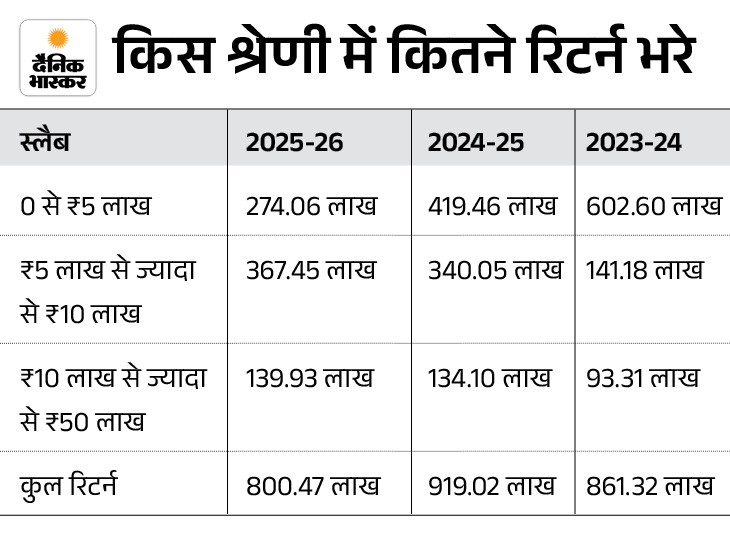 वित्त वर्ष 2023-24 में 5 लाख से 10 लाख की आय ब्रैकेट में 16.39% लोगों ने रिटर्न भरा था। इसी क्रम में 2024-25 में 37% लोगों ने रिटर्न भरा, जबकि 2025-26 में यह 46% हो चुका है।