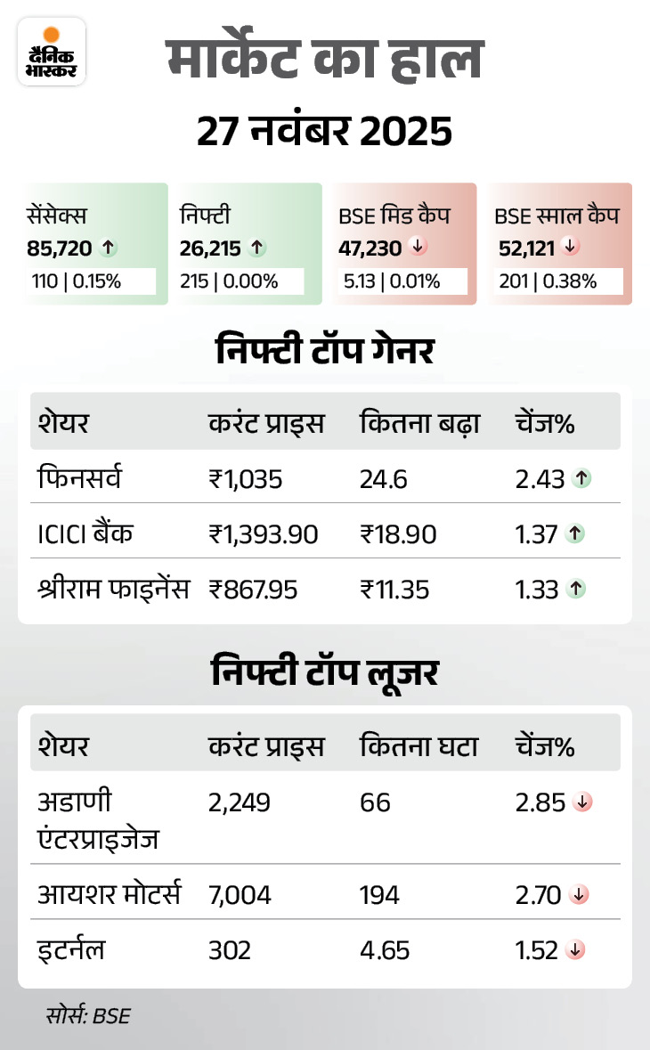 हालांकि बाद में ये ऑल टाईम हाई से नीचे आया। सेंसेक्स केवल 110 अंक की तेजी के साथ 85,720 पर बंद हुआ है। वहीं निफ्टी में 10 अंक की तेजी रही। ये 26,215 पर बंद हुआ। निफ्टी के ऑटो, फाइनेंस और बैंकिंग शेयर्स में तेजी रही। वहीं IT और रियल्टी सेक्टर में गिरावट आई।