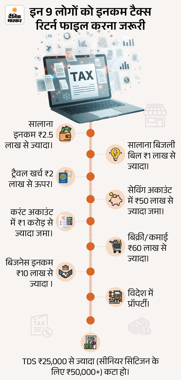 4. इनकम टैक्स रिटर्न फाइल नहीं किया तो रिफंड अटक सकता है अगर आपने अभी तक वित्त वर्ष 2024-25 का इनकम टैक्स रिटर्न (ITR) फाइल नहीं किया है तो लेट फीस के साथ 31 दिसंबर 2025 फाइल कर सकते हैं। ऐसा न करने पर नोटिस आने के साथ ही इनकम टैक्स डिपार्टमेंट जुर्माना भी लगा सकता है।