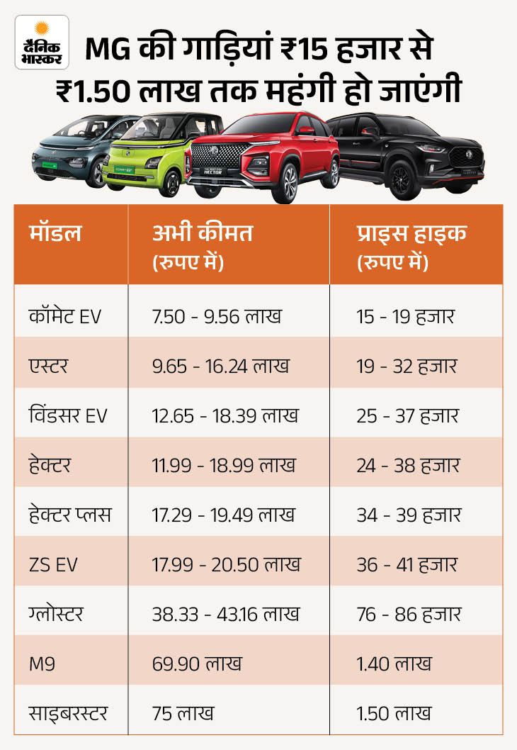 इनपुट कॉस्ट बढ़ने से MG मोटर ने कारों की कीमत 2% तक बढ़ाई है। इससे MG हेक्टर 38 हजार रुपए महंगी मिलेगी। MG के अलावा लग्जरी सेगमेंट में मर्सिडीज और BMW ने कीमत 2-3% तक बढ़ाने का ऐलान किया है।